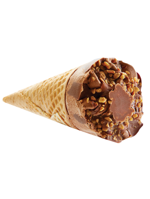 Ce cornet gourmand contient une crème glacée chocolat, ornée de chocolat au lait avec éclats de noisettes. Il est parfaitement accompagné d’une gaufrette sucrée croquante, qui se termine par un bout chocolaté, ajoutant une touche gourmande